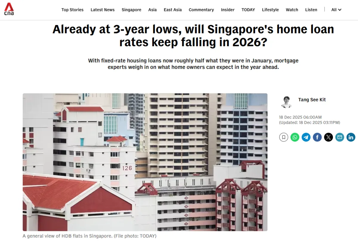 In a recent interview with 𝗖𝗵𝗮𝗻𝗻𝗲𝗹 𝗡𝗲𝘄𝘀𝗔𝘀𝗶𝗮 (𝗖𝗡𝗔), SingCapital CEO, Alfred Chia highlighted that fixed-rate housing loans have almost halved, easing from around 3.1% at the start of 2025 to approximately 1.4%–1.8% today, depending on loan quantum. He also noted that banks have trimmed loan spreads and are expected to continue offering competitive mortgage packages, particularly in the early part of the year as competition for market share intensifies.