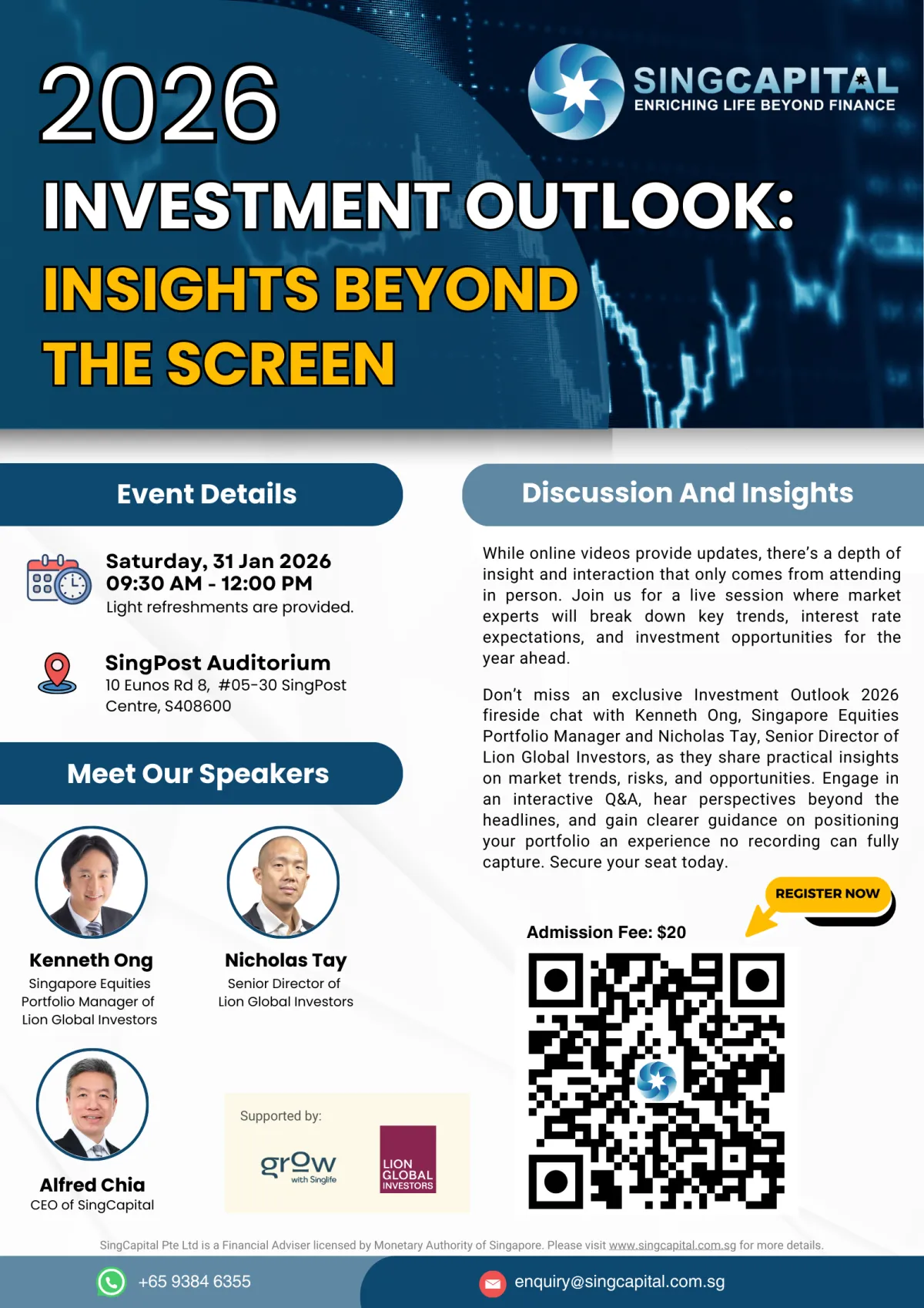 At SingCapital’s 2026 Investment Outlook, our CEO, Mr Alfred Chia, will share his insights on key market trends, interest rate forecasts, and investment opportunities for the year ahead. Attendees will gain actionable strategies and participate in an interactive Q&A — an experience that goes well beyond what online videos can provide.